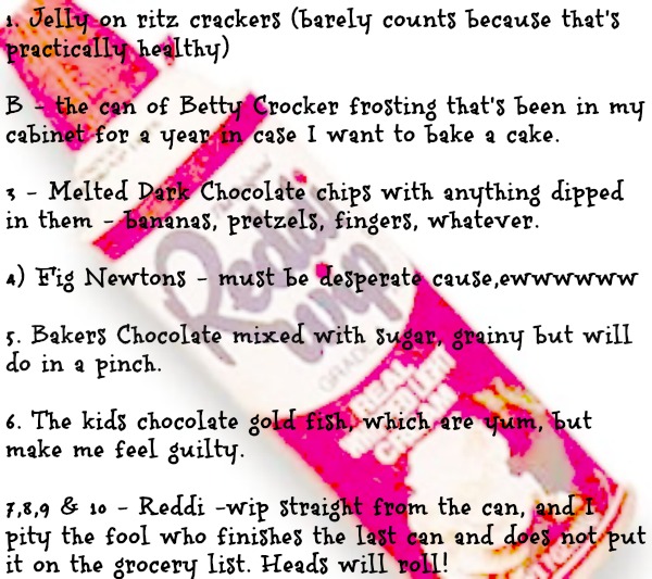 9. Ha! Oh those late night sweets cravings! I showed my kids the Redi-Whip straight in the mouth thing not all that long ago. Totally blew their minds! (By the way, they now make frosting in those squirty cans. They say it’s for cupcake decorating, but I think it’s really for late night cravings!)